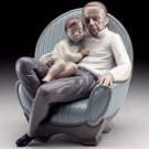 Toddler girl in white nightdress seated in lap of caricatured grandfather
