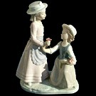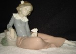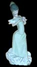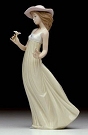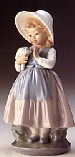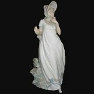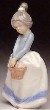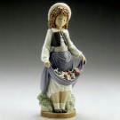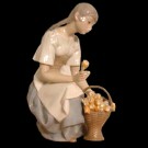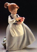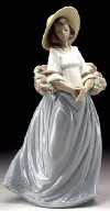 white dress with blue belt and holding molded rose in hand and basket of molded roses in crook of right arm.