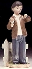 shirt and blue trousers, holding molded flower bouquet behind his back,