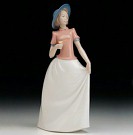 hat with left hand and carrying bouquet of pink flowers in her right. |