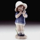 See official NAO web site. Little girl in long blue and white short-sleeved dress, reaching up to touch her brimmed