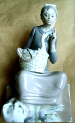 [Traveling Girl with Duck] Girl with raised finger admonishing duck, held in basket on her lap. She is seated on a standing suitcase, a traveling bundle at her feet. Impressed NAO mark. $175-$200