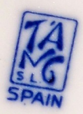 At right, collector Paul Crawford has graciously supplied a photo of a Tang in his own collection that also has the Tang cobalt blue mark. Although the model is very like Lladró model #4510 ("Girl with Umbrella"), there are notable differences - such as the reverse orientation of the entire figure (Lladró #4510 has the basket on the model's right and the umbrella on her left), the scarf across the lower part of the face on the Tang model, and the slightly different orientation in the two models of the arm holding the basket. (Collector Teresa Bennett has an identical model to this Tang but with an impressed Lladró mark. It's not unusual for Lladró to make modifications in its models, and it's likely that what we eventually came to know as core collection model #4510 began its life as this variant.)