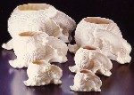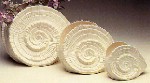 Three white models of snail's shell in graduated sizes, with opening