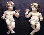 Mirror image wingless cherubs, each holding a cup |